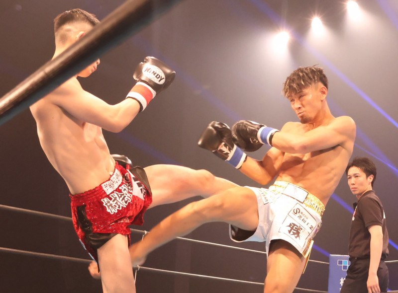 安本(右)がミドルキック、髙橋はローキックを蹴り込む(左)=前戦