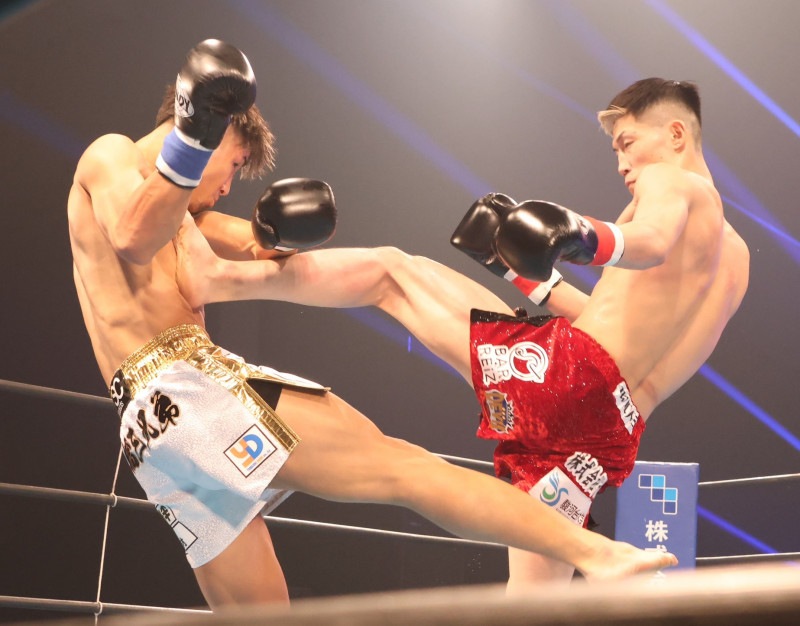 安本(右)が前蹴りも、ローを蹴り込む髙橋(左)=前戦
