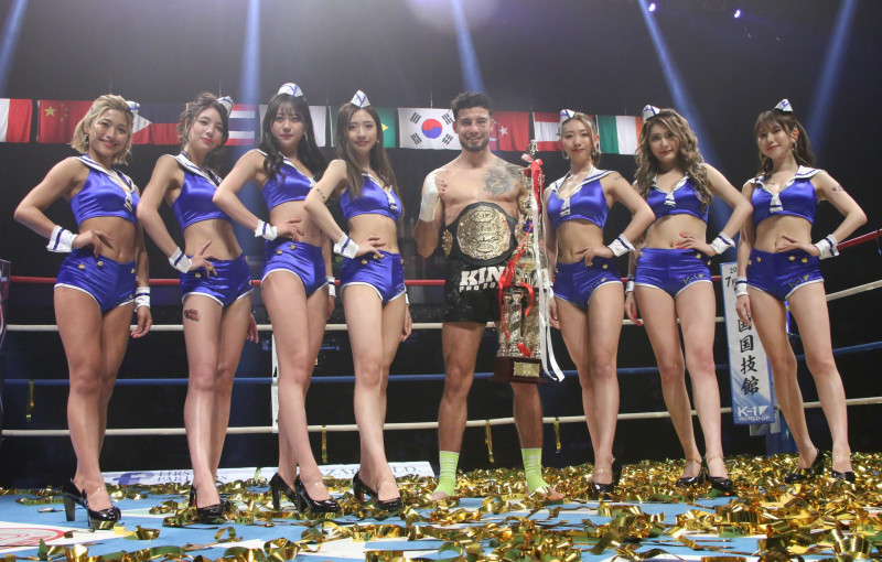ベルトを巻いたハッサンとK-1ガールズが並ぶ