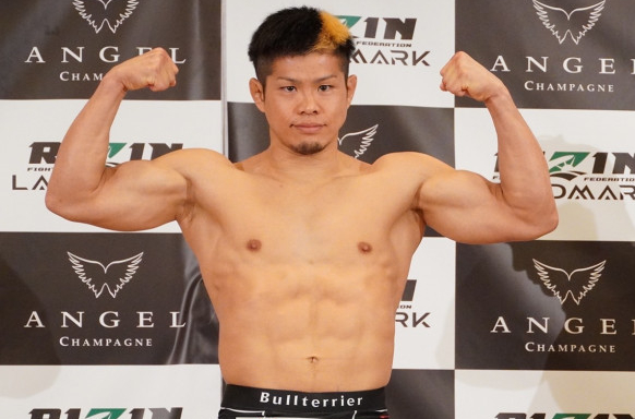 鈴木がマッスルポーズで計量パス(写真は昨年11月の青井人戦)