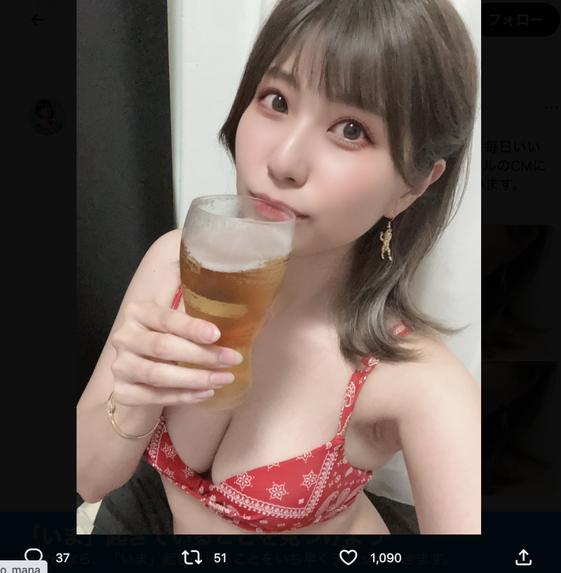 ビールを飲む動画3500回目をアップした天野麻菜(@akaringo_manaより)