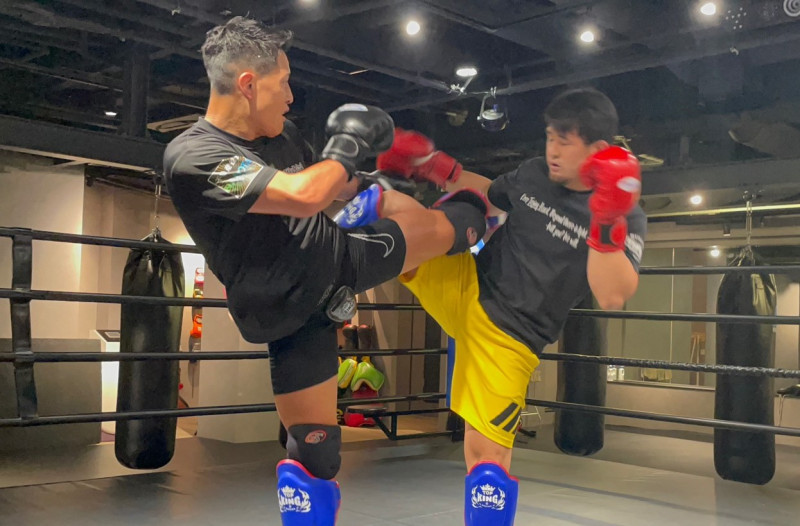 大雅(左)がスパーリングで兄HIROYAにキックを蹴り込む(2023年6月8日、公開練習)ⒸAbemaTV, inc.