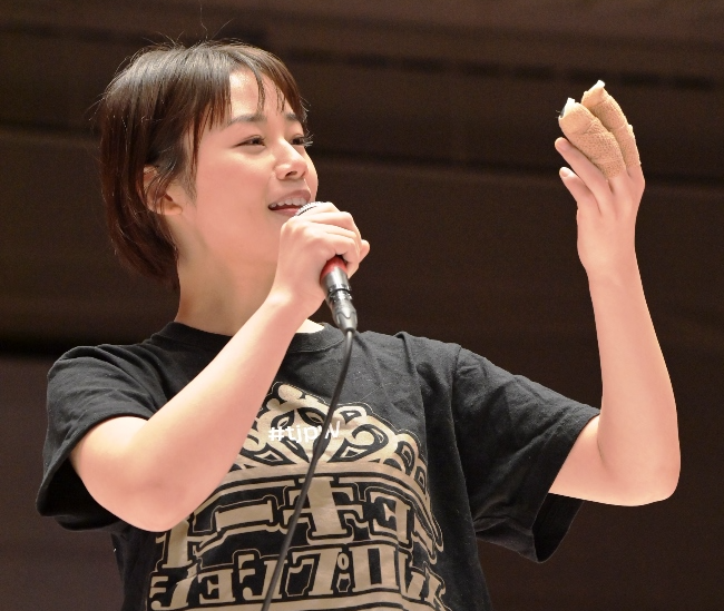 リング上で左手の怪我の状態を説明する長野じゅりあ