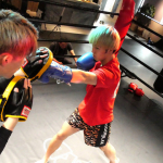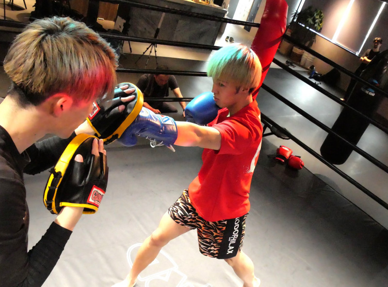 ミット打ちを見せた田丸(右)(C)RISE