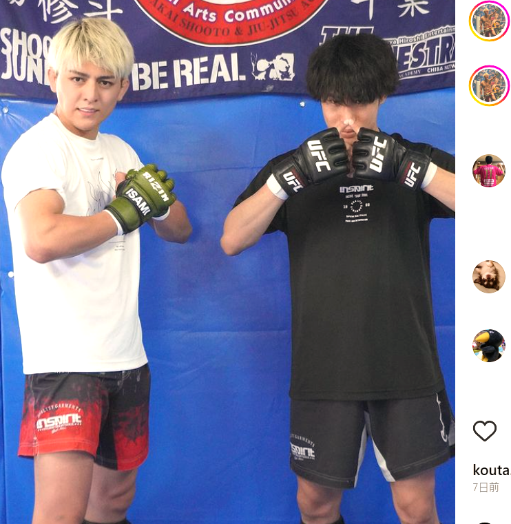 鈴木(左)がUFCファイターの平良達郎(右)と沖縄合宿を行った(@chihiro19990514)