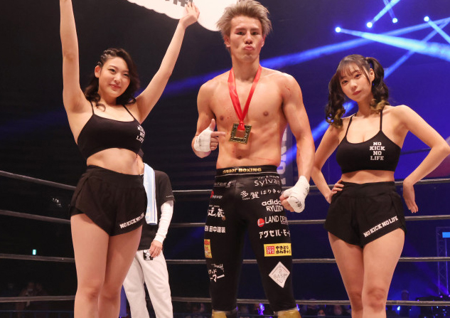 ラウンドガール姿の風吹ケイ(左)、青山ひかる(右)