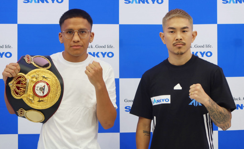 試合を一週間後に控えた井岡(右)とフランコ(左)が会見で対面した