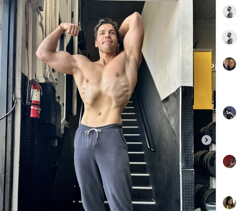 父親のようなグレーのスゥエットパンツを履いてマッスルポーズのバエナ(@joebaenaより)