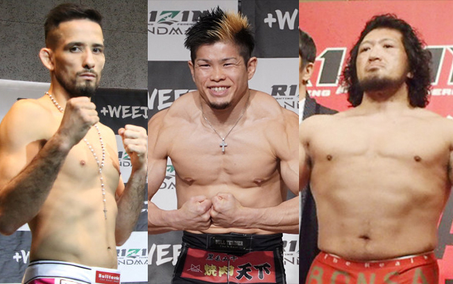 過去の前日計量、左からクレベル、鈴木、関根。SNSでは計量3日前にマッスポーズを決め話題に!