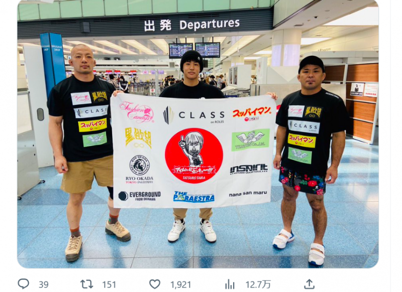 今月17日、出国を報告した平良。右が松根良太会長、左は今年プロデビューした西条英成(@tatsuro_ch)