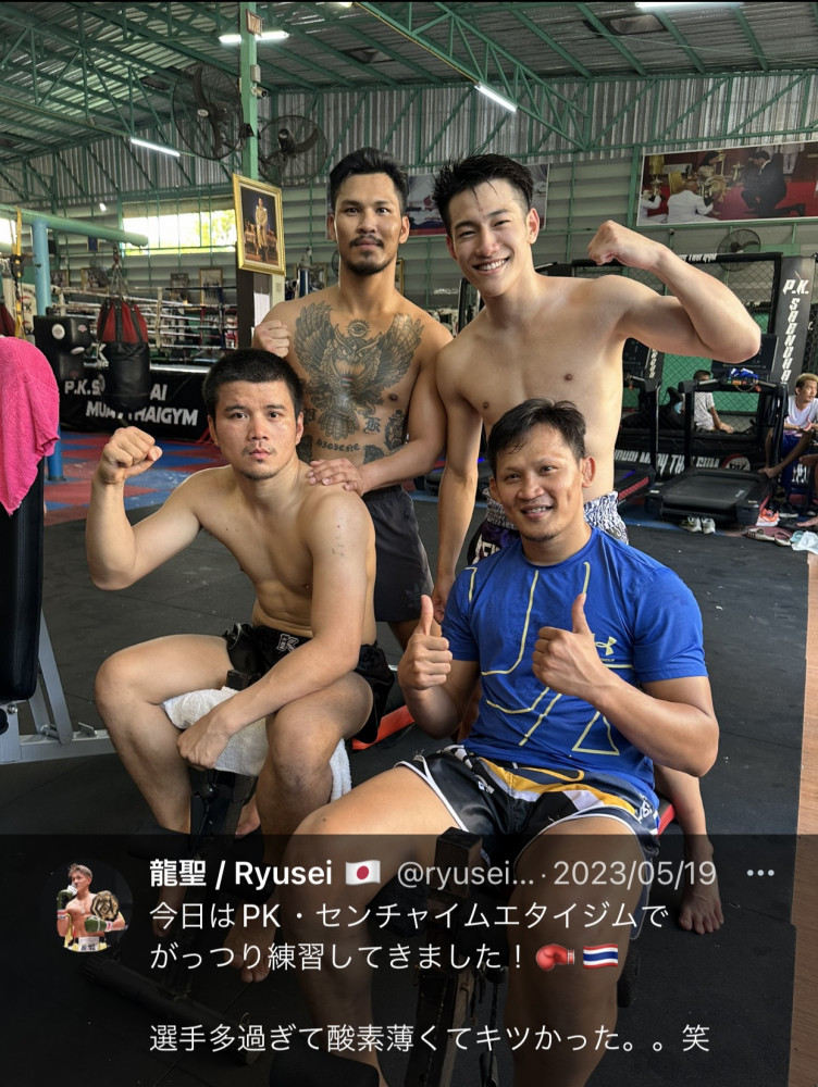 KNOCK OUT王者・龍聖(後列右)と練習したスアキム(左)=今年5月 @ryusei_411