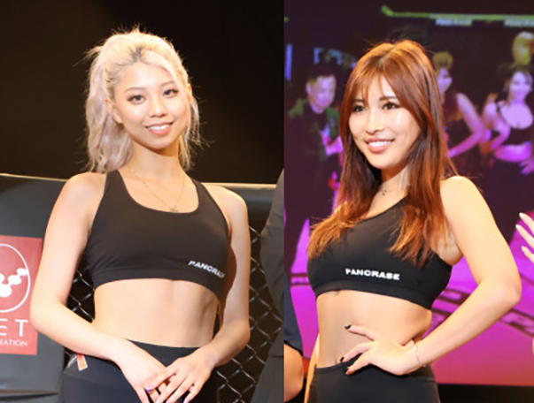 前回に続きラウンドガールを務める2人、7.9は、さらに3人が加わる。左は元キャバ嬢のフィットネストレーナーせりざわりの、右は井岡戦で”褐色のグラマラス”と話題となった、りさぶー