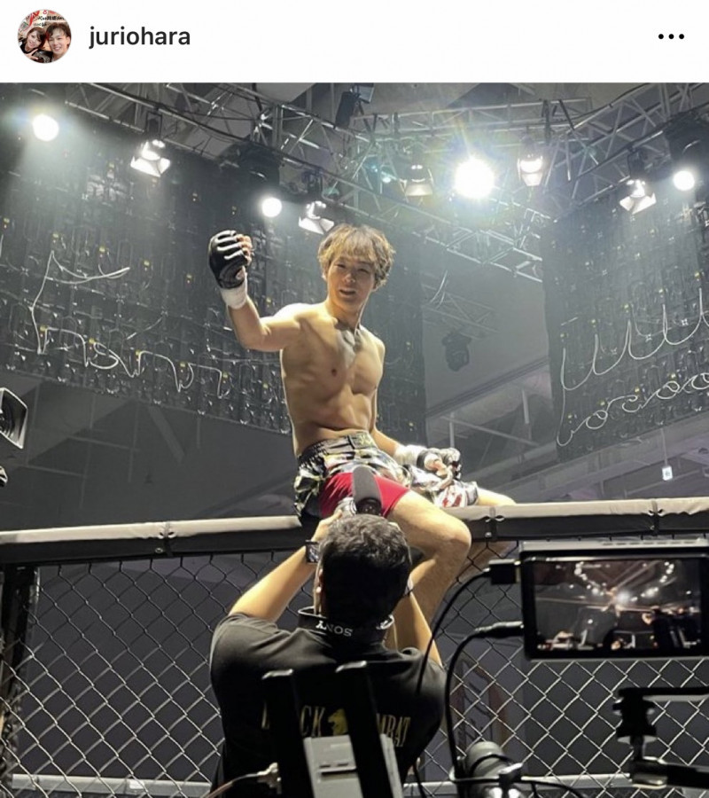 大原がケージの上で勝利のガッツポーズ@juriohara