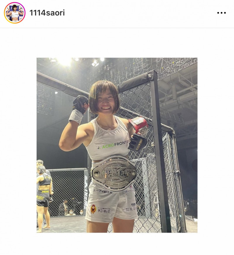 大島が2つのベルト持ち喜びの笑顔 @1114saori より