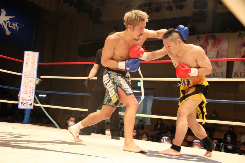 昨年11月のKrushで“レジェンド”大月晴明(右)を追い込む東本央貴