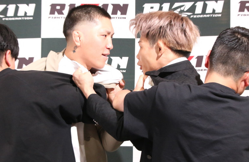 朝倉未来の愛弟子ヒロヤ(右)は伊藤裕樹(左)と対戦相手発表会見で乱闘騒ぎに