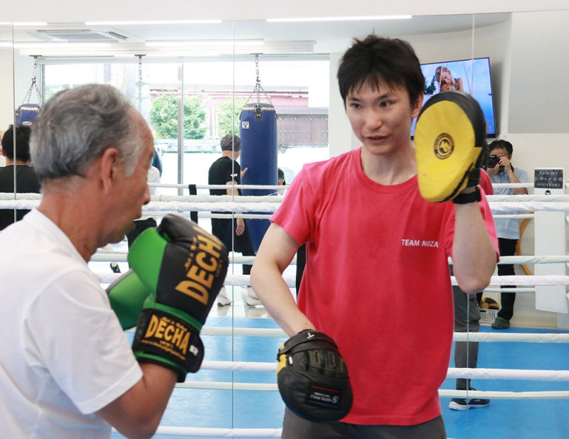 ミットを持ち市民に直接指導する渡邉宏さん(右)