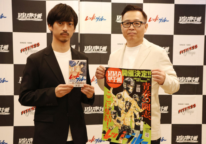 手には漫画「レッドブルー」とMMA甲子園のポスター