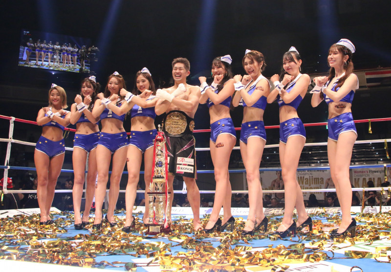 勝利した和島とラウンドガールが並ぶ