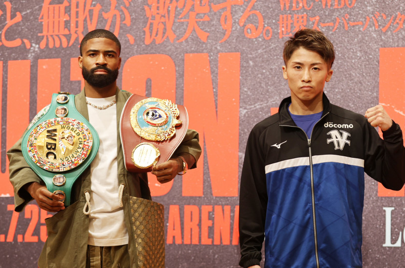 井上尚弥(左)と、王者スティーブン・フルトン(右)が会見で対面した