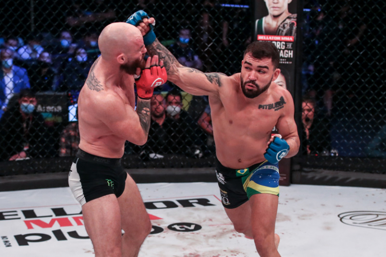 剛腕をでKO勝利する元ベラトール ライト級王者パトリッキー(右)