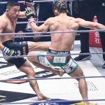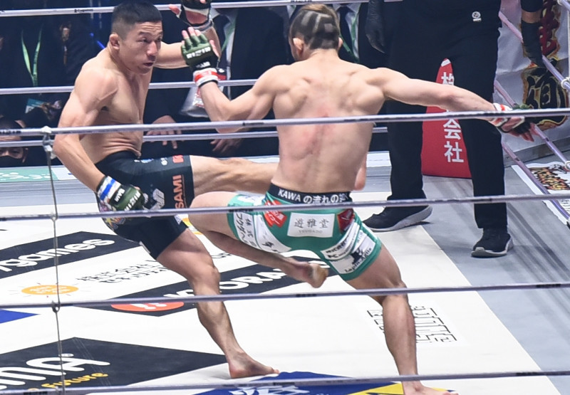 堀口の右カーフキックは強烈だが、サウスポー構えの神龍にどう使うのか注目される