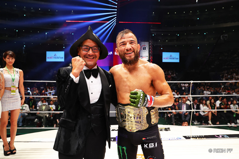 ベルトを腰に巻き榊原代表と笑顔のアーチュレッタ©️RIZIN