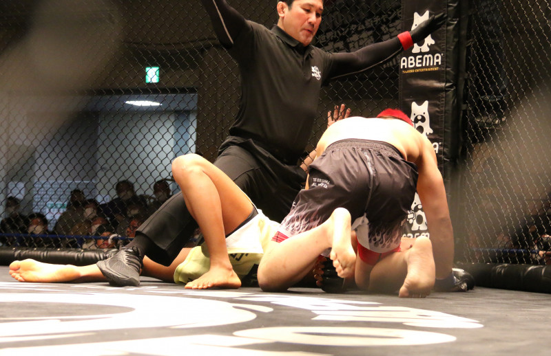 椿がマットに落とされ、レフェリーストップ