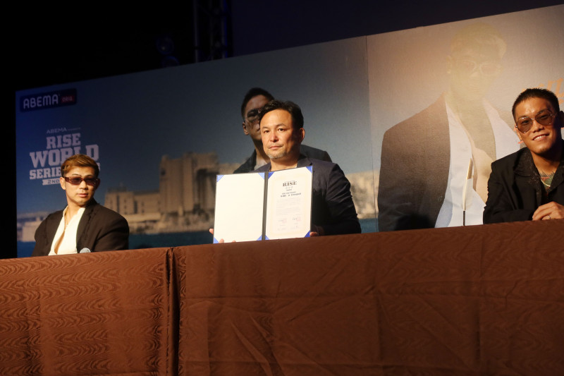 YA-MAN(左)と山口(右)のサインを入れた調印書が公開された