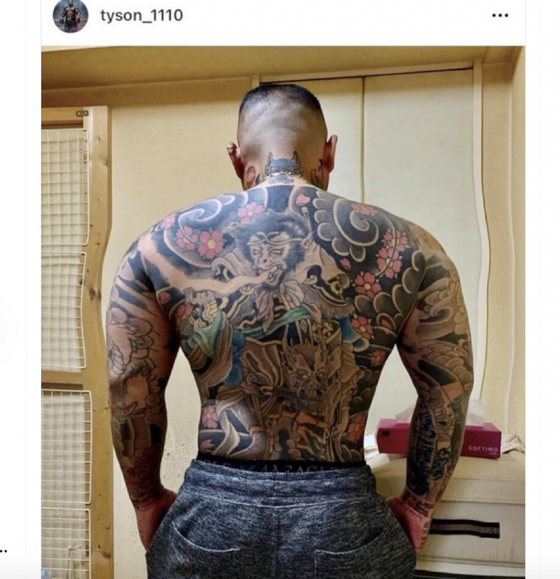 ノッコンがシェアしたタイソンの背中、ウエストが細すぎる。背景も歪んでおり、加工したものとわかる。刺青は本物。タイソンの過去アカウントのもの