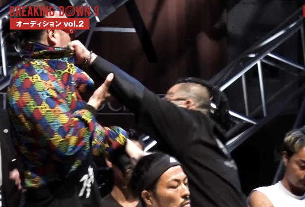 ブレイキングダウン9のオーディションでが、所沢のタイソン(右)とごぼう奥野(左)乱闘騒ぎ(『朝倉未来』YouTubeチャンネル)
