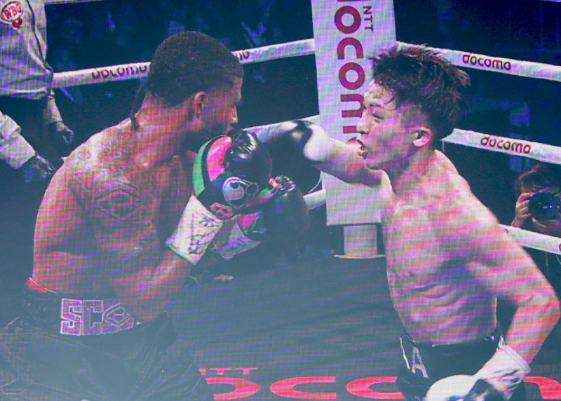 2、左の前手が下がってガードが空いたのを見逃さず右ストレートへ!(会場の大型ビジョンより)