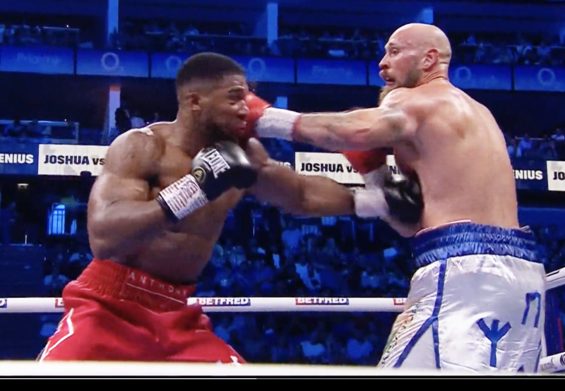 1、ジョシュアの左ジャブを相手は右で受けるのと同時に左でジャブ、これで顔面がガラ空きに!(C)DAZN