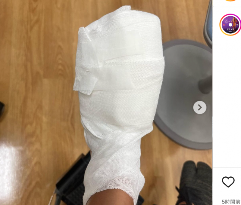足指を骨折し包帯を巻いた安井の足(@yuri.yasui.98より)