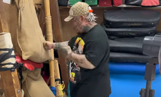 砂袋で拳を鍛える久保(『所沢のタイソン』YouTubeチャンネル)