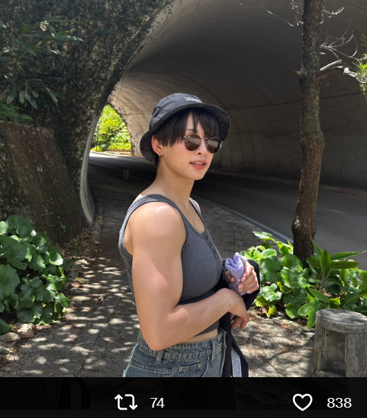 タンクトップ姿からのぞくマッスルな二の腕写真を公開した出口クリスタ(2023年7月9日、@10CMD29)