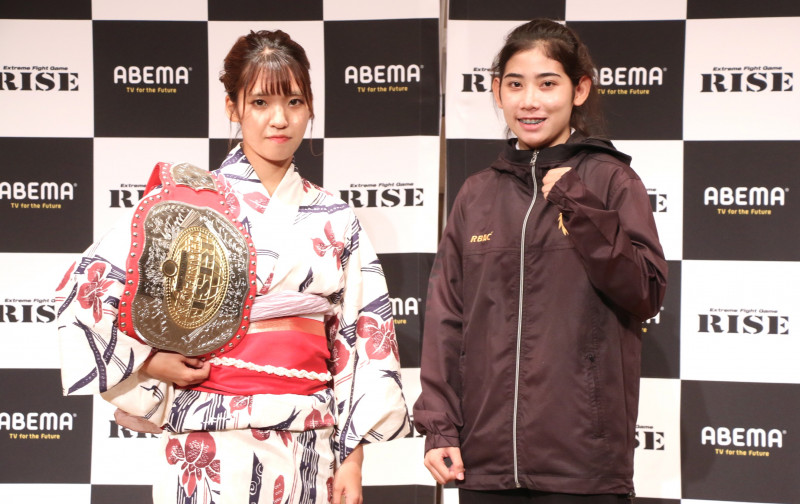 浴衣姿の宮﨑小雪は、ベルトを肩にかけてジュムリアットと並んだ