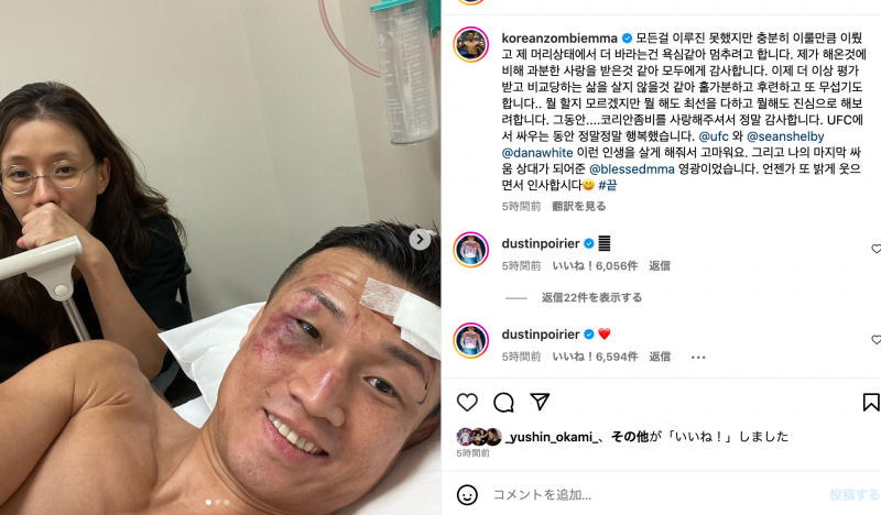 試合後、自身のインスタで引退後の感謝のメッセージを送るチャンソン@koreanzombiemmaより