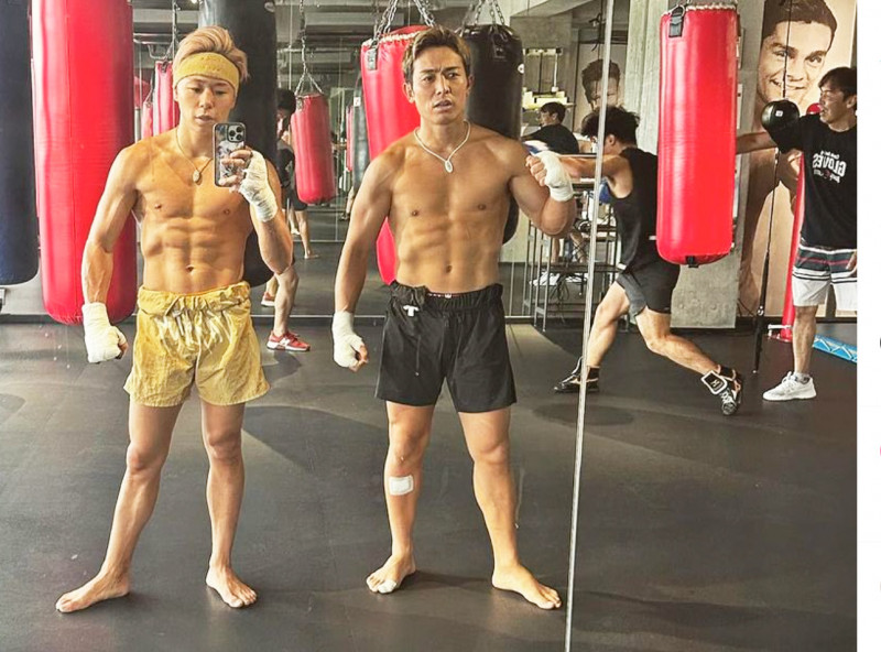 武尊(左)がバキバキの腹筋を披露!(武尊のXより)