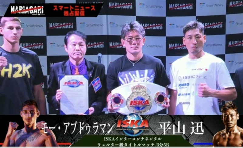 ISKAのベルトを持つ皇治CEO(右から2番目)(YouTube皇治チャンネルより)