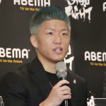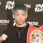 2度目、頭から突っ込む王者、重岡のアゴにヒット!