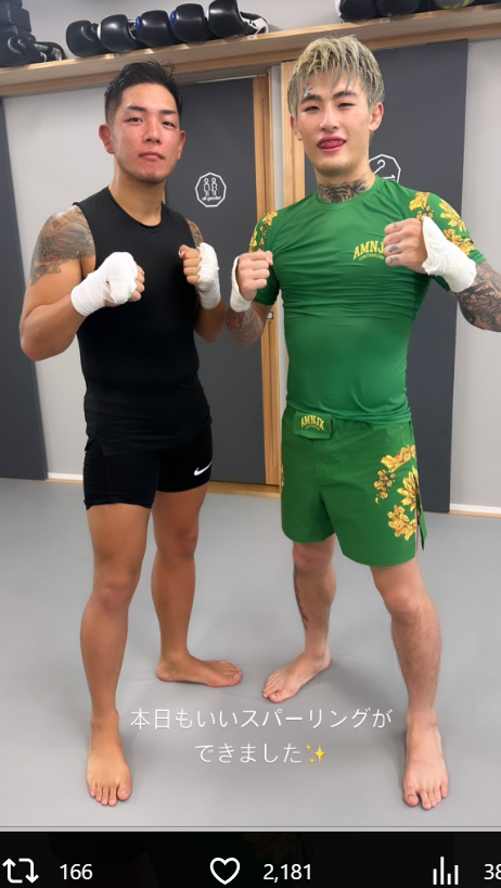 弘輝がSNSに投稿した平本蓮とのスパーリング後の写真(@hi199614)=2023年9月5日