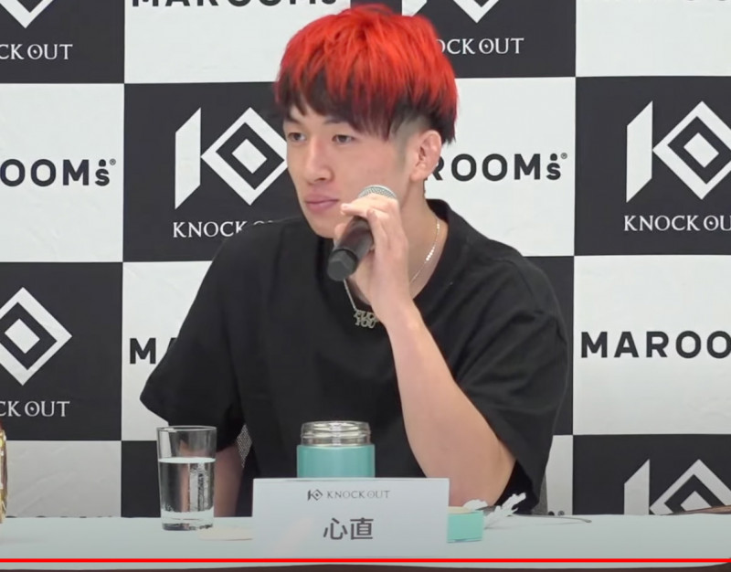 会見で勝手にお粥を食べる心直(KNOCK OUT公式YouTubeより)