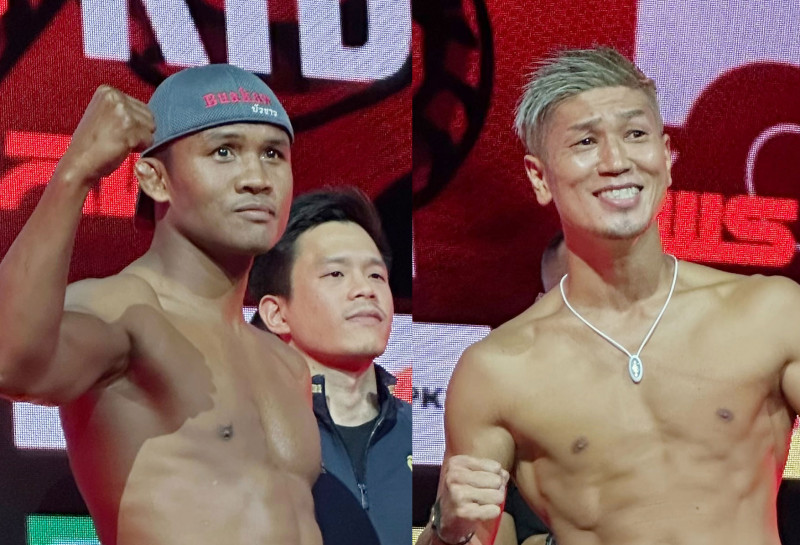 73kg契約で計量パスしたブアカーオ(左)と城戸康裕(右)