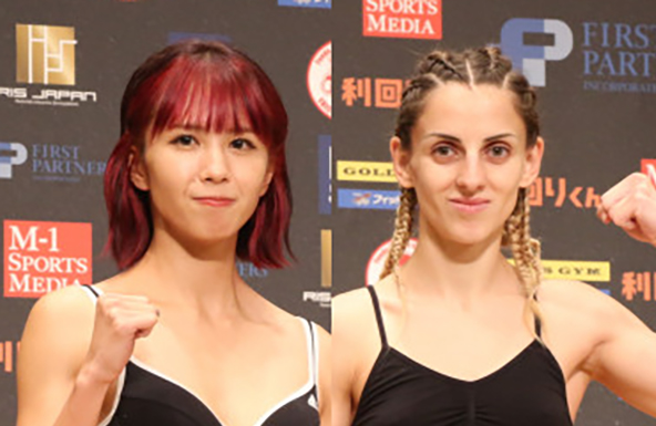 女王・菅原美優(左)は美腹筋、挑戦者マリア(右)はバキバキ腹筋で計量パス!