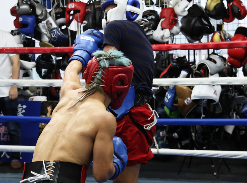 銀次朗(赤)が踏み込んでパンチを伸ばす
