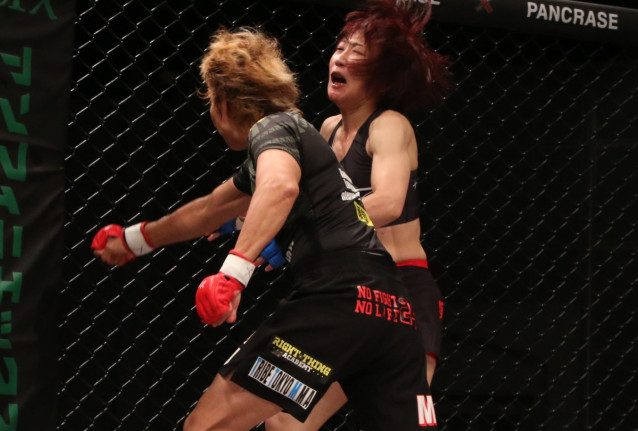 前戦は、この右のパンチでTKO勝利を収めたライカ(左)