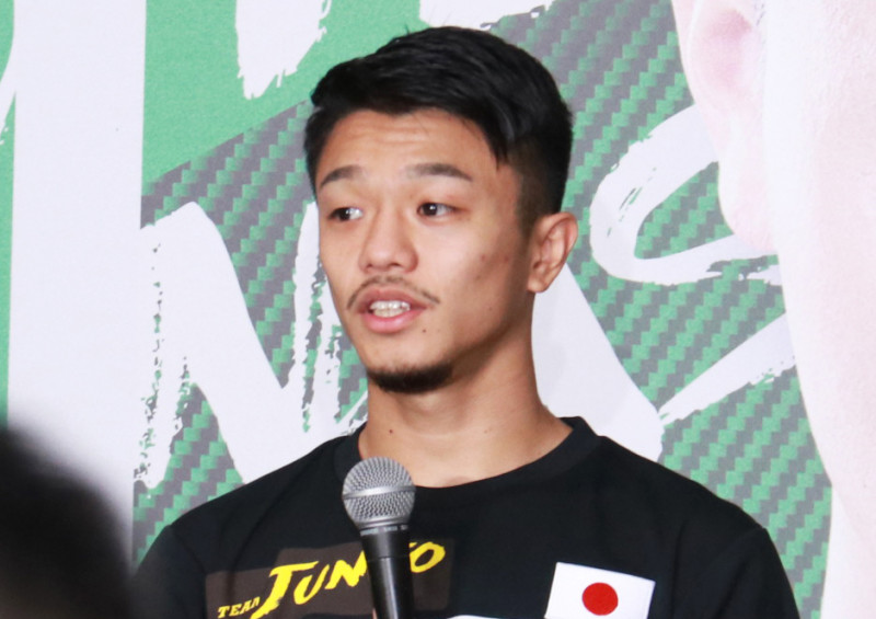試合後の会見で話す中谷