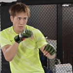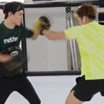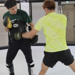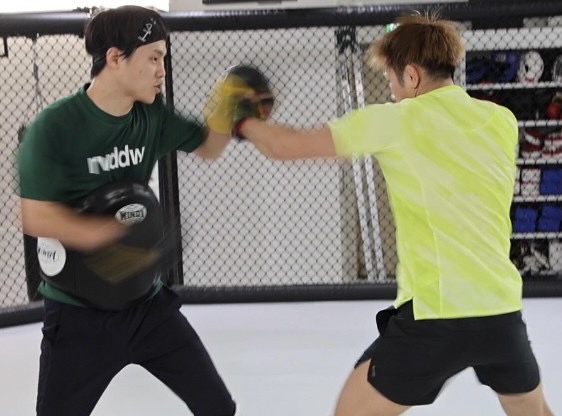 ミットにパンチを打ち込む白川(右)