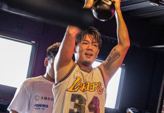 ケトルベルをアームカールで持ち上げる皇治(『皇治インスタグラム』)